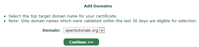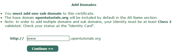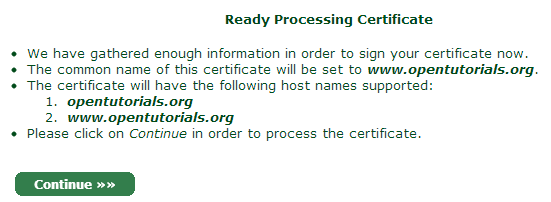 아래와 같이 입력하면 StartSSL은 opentutorials.org와 www.opentutorials.org에 대해서만 보호 기능을 제공한다. 만약 dev.opentutorials.org에 대해서 SSL 서비스를 하고 싶다면 인증서를 하나 더 만들어야 한다. www나 dev와 같은 부분을 호스트 네임이라고 하는데 모든 호스트 네임에 대해서 보호되는 인증서를 사용하고 싶다면 와일드 카드 인증서를 구입해야 한다. 인증서를 비교한 차트에서 와일드 카드 항목을 참고하면 된다.http://www.startssl.com/?app=40