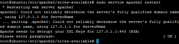10. apache를 재시작한다. 재시작 할 때 비밀번호를 물어보는 경우가 있다. 이것은 비공개키를 생성하는 단계에서 입력한 비밀번호를 입력하면 된다.