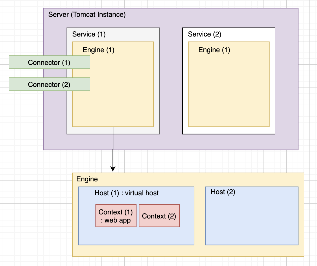 하나의 Server 에는 여러 개의 Service 가 존재할 수 있습니다. 각각의 Service는 1개의 1개의 Engine 과 여러 개의 Connector 로 구성됩니다.