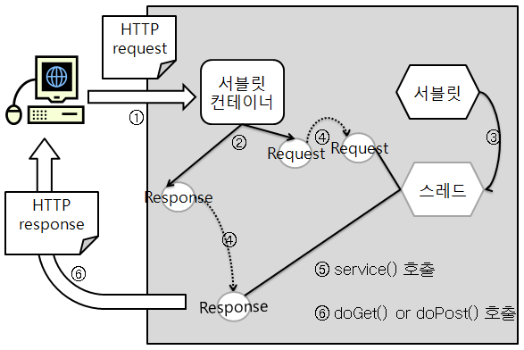 * 컨테이너가 요청다루기 * 1. 사용자가 서블릿에 대한 요청을 클릭 2. 컨테이너는 들어온 요청이 서블릿이라는 것을 간파하곤 HttpservletRequest, HttpServletResponse 객채생성 3. 사용자가 날린 url을 분석하여 어떤 서블릿에 대한 요청인지 알아내고 해당 서블릿의 스레드를 생성하여 request,response 전달 4. 컨테이너는 서블릿의 service() 메소드를 호출 -> service()에서는 doGet()을 호출할지 doPost를 호출할지 결정(일단 doGet으 로 간주) 5. doGet()메소드는 동적인 페이지를생성한 다음, 이를 response객체에 실어 보낸다. 보내고 난 후에도 response에 대한 레퍼런스를 가지고 있다. 6. 스레드 작업이 끝나면 컨테이너는 response객체 를 HttpResponse로 전환하여 클라이언트로 내려보낸다. 이제 마지막으로 Request와 Response 객체를 소멸.