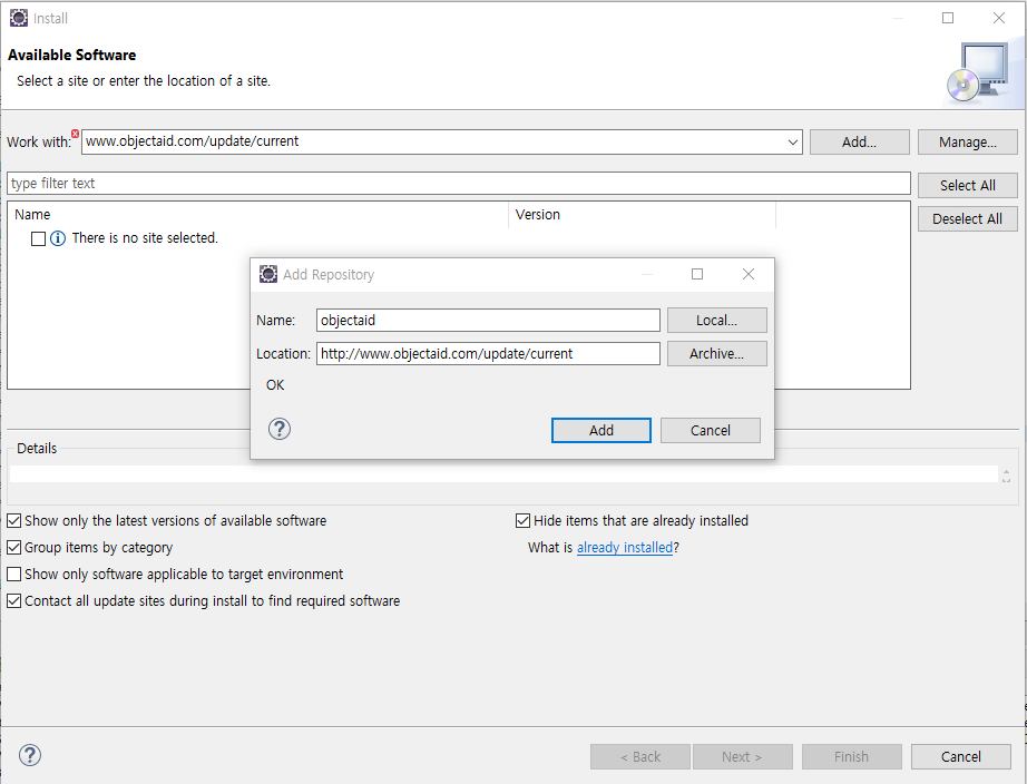 www.objectaid.com/update/current 를 Install New Software... 화면에 넣고 Add... 버튼을 누른다.