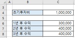두번째 인수 C6:C8은 현금흐름(수익)의 범위이다.