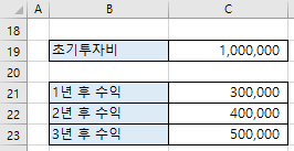 두번째 인수 C21:C23은 현금흐름(수익)의 범위이다.