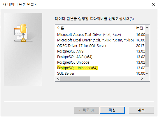 컴퓨터에 설치된 드라이버 중, PostgreSQL Unicode(x64) 드라이버를 선택한 후, [마침]을 누릅니다.