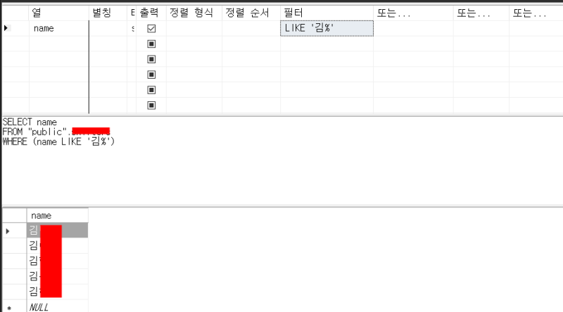 두번째 영역에서, 필터 열의 값으로, " LIKE '김%' "를 입력했습니다. name의 값 중, '김'으로 시작하는 값을 찾기 위한 것입니다.