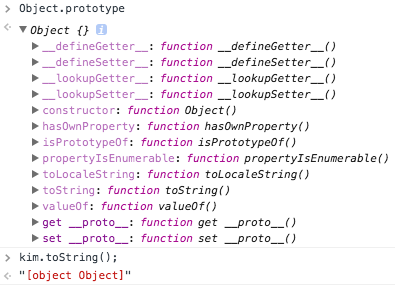 이런 프로토타입 체인 구조 때문에 모든 객체는 Object의 자식이라고 불리고, Object Prototype Object에 있는 모든 속성을 사용할 수 있습니다. 한 가지 예를 들면 toString함수가 있겠습니다.